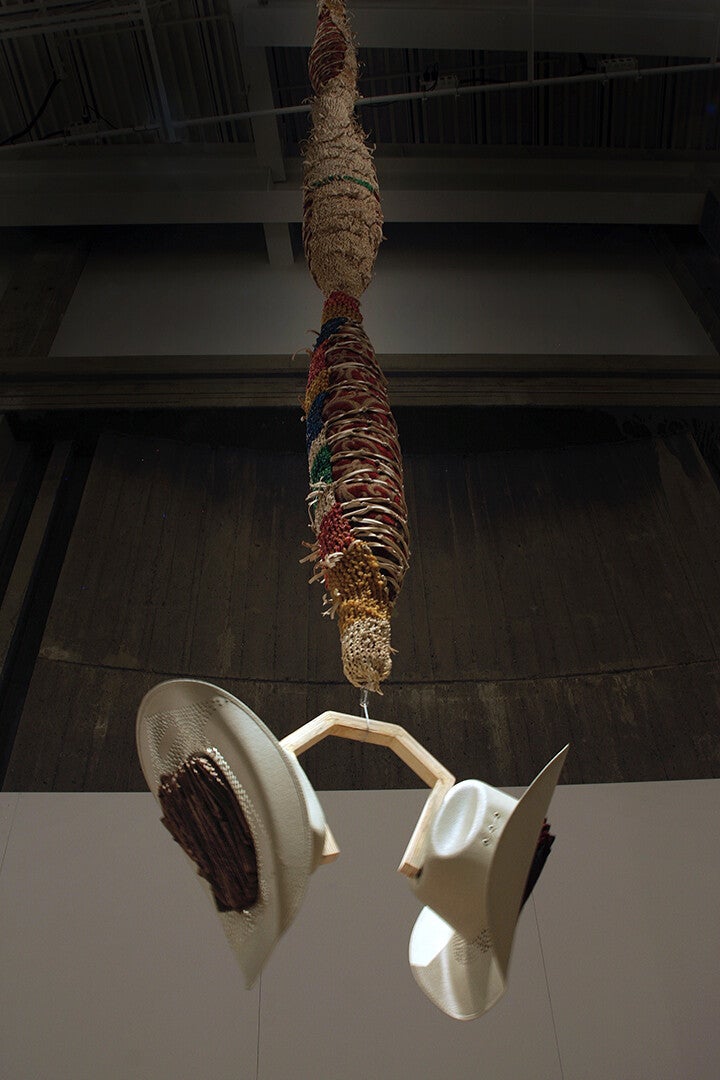 At the heart of "Demulsify," two white Smithbilt cowboy hats are suspended from the ceiling. These hats, icons of Calgary's corporate identity since 1946 and typically bestowed upon distinguished visitors, are reimagined here to convey a poignant narrative. One hat overflows with 131 folded brown paper lunch bags, emblematic of the meals Calgary's school children bring from home, while the other is filled with business ties.