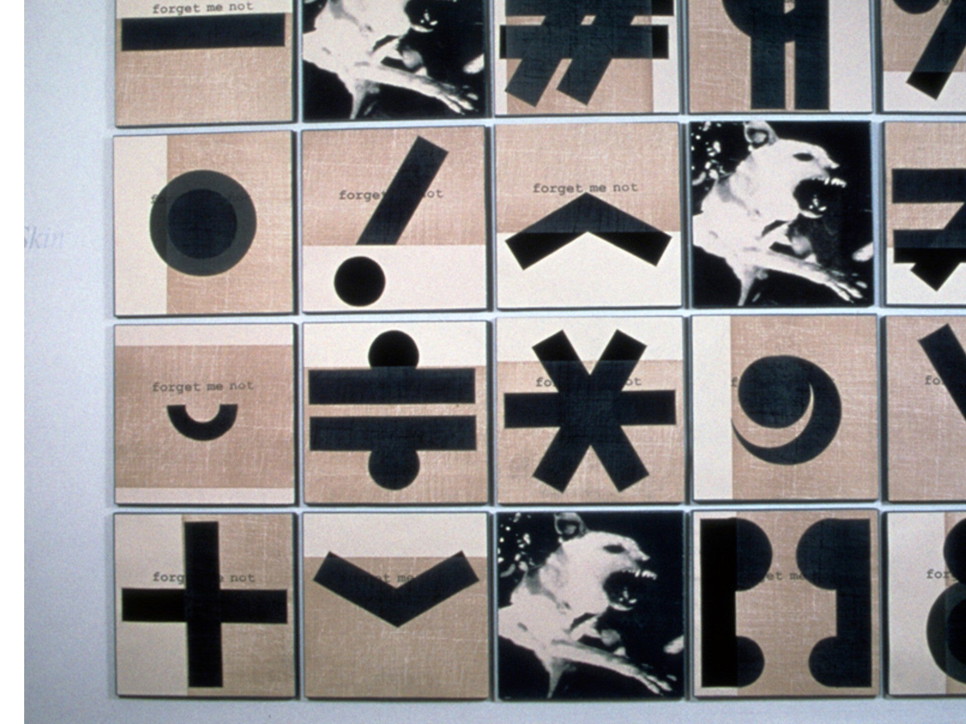 To underscore this experience, I juxtaposed the phrase "Forget Me Not" over each punctuation mark panel. This contrast between the rote memorization involved in language learning and the eroding effects of Alzheimer's disease on both short-term and long-term memory serves as a poignant commentary on the nature of memory and learning.