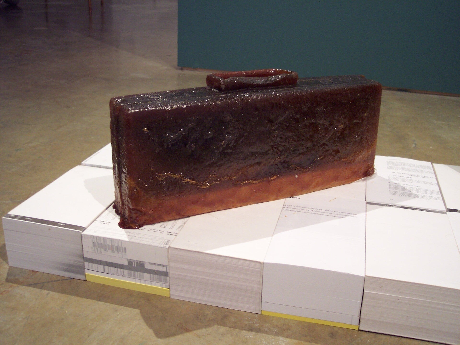 This mixed-media installation occupies 500 square feet and explores the intricate dynamics between corporations, production, and consumers across first and third world countries. Utilizing diverse elements such as text, sugar, briefcase, top hat, soldier camouflage, and saddle, it invites reflection on global interconnections.